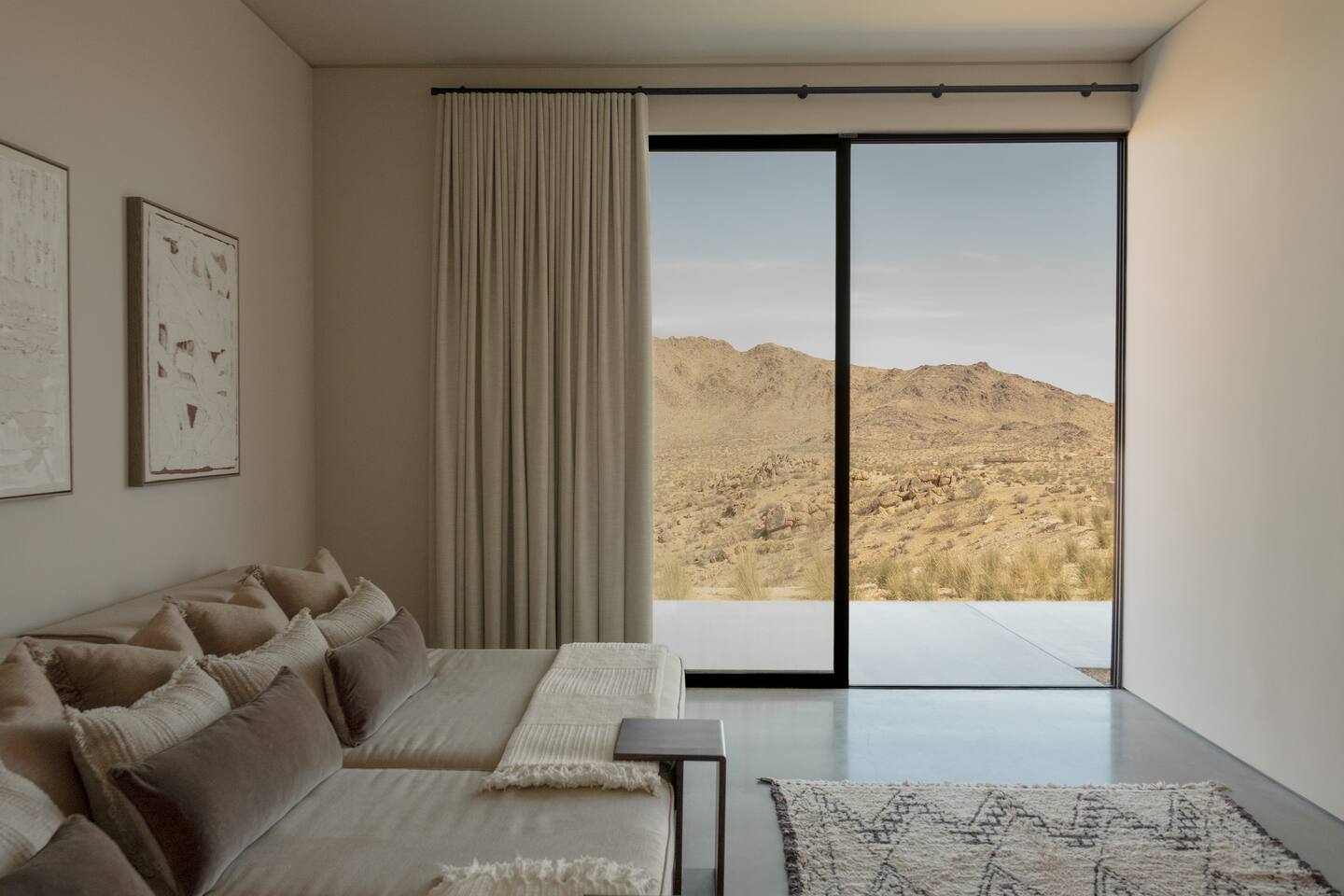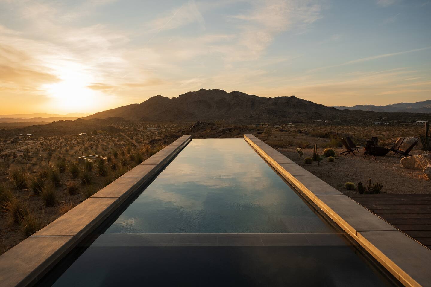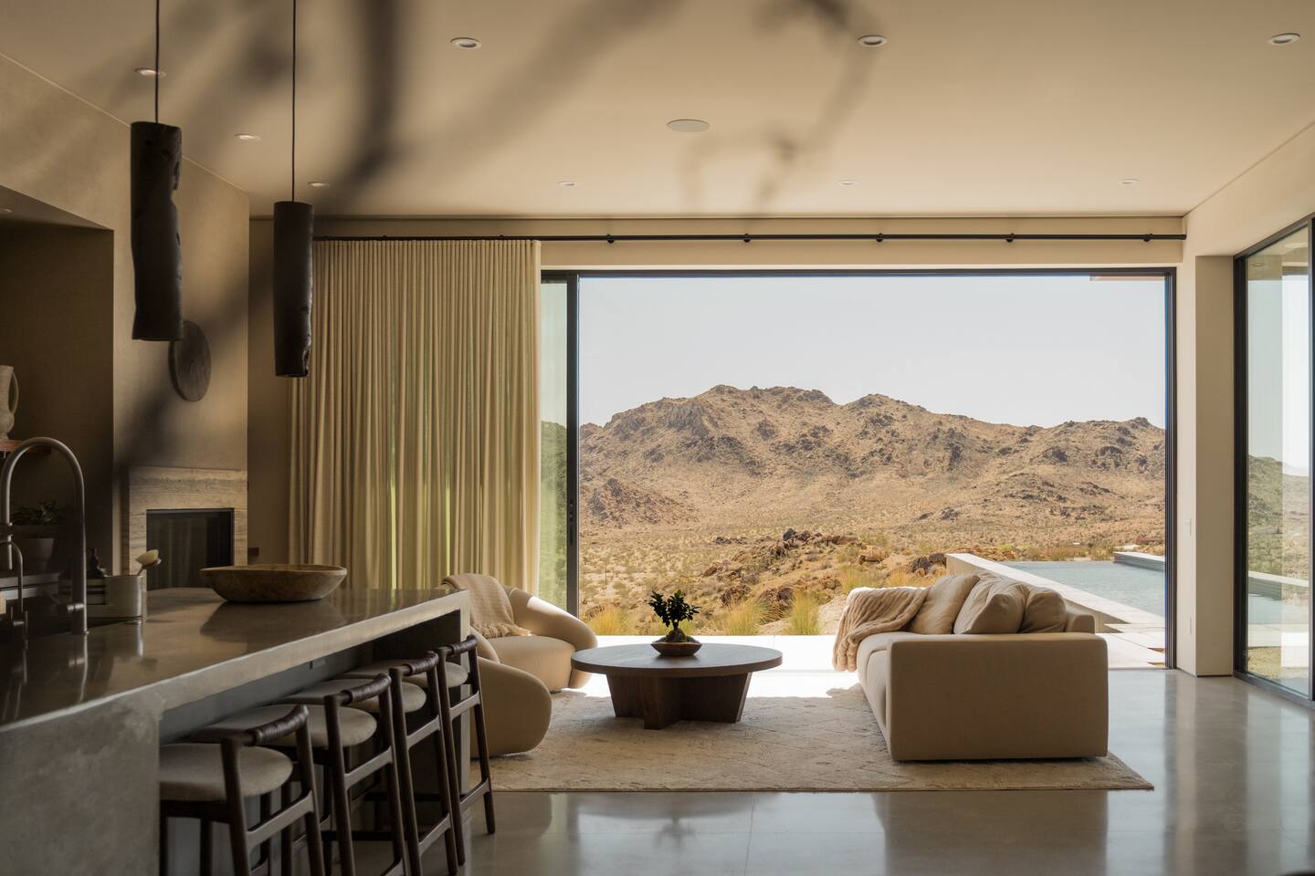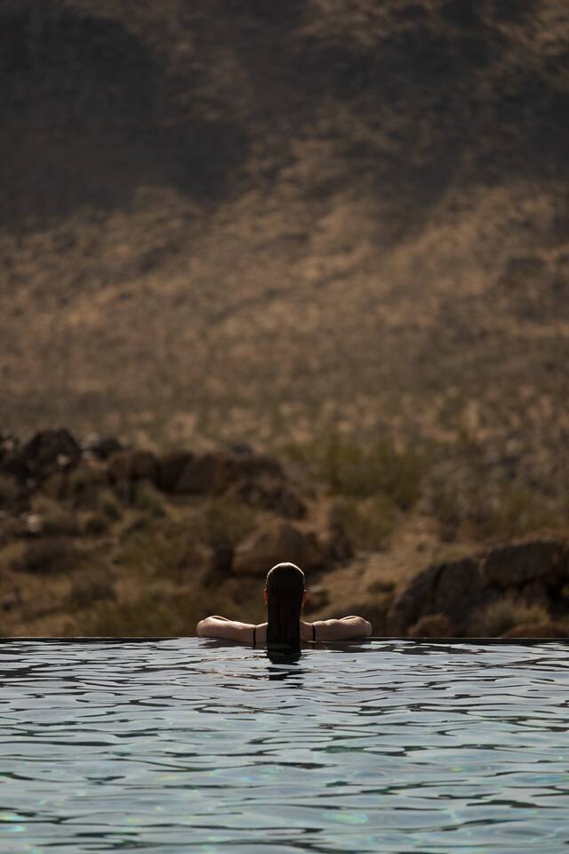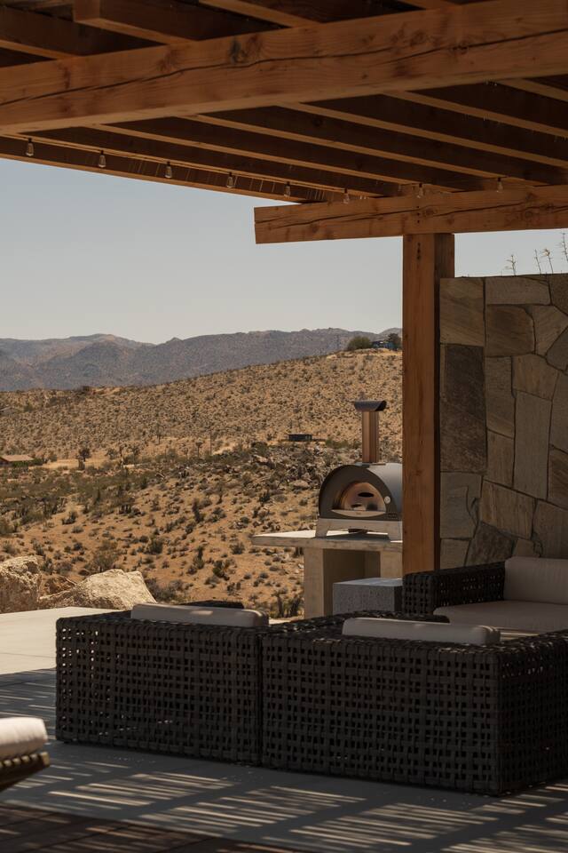 Amenities include: - 360’ views - Movie room - Indoor fireplace - Starlink Internet - Outdoor shower - Luxury furnishings - Outdoor gas fire-pit - 80’ infinity pool + spa - Retractable walls of glass - Bala and yoga equipment - Expansive indoor living area - Outdoor kitchen with pizza oven - Nearly 3000 sq feet of living space - Non-toxic cookware and cleaning supplies - Curated linens, robes and spa inspired amenities Perched atop a commanding promontory in the high desert, this architectural statement offers one of the most dramatic arrivals in Joshua Tree. A bold, brutalist entry frames the vast horizon, drawing you into a retreat defined by scale, precision, and sweeping 360-degree views that stretch to the snowcapped peaks beyond Joshua Tree National Park. At its heart, an 80-foot infinity pool cascades seamlessly toward the desert expanse, creating a mirrored plane that dissolves the boundary between earth and sky. Adjacent, a fully equipped outdoor kitchen invites open-air dining under the desert sun, while firelit evenings unfold against the endless horizon. Inside, luxury is expressed through natural materials and impeccable craftsmanship. Expansive sliding glass doors dissolve into the walls, erasing the threshold between indoors and out, and allowing the landscape to become part of the architecture. Furnishings throughout are curated for both comfort and sophistication, striking a balance between modern refinement and desert serenity. A private movie room offers intimate gatherings and cinematic experiences, while open-plan living areas orient toward the ever-changing desert light. Bedrooms are designed as sanctuaries, where walls of glass frame the vast panorama, offering a sense of quiet immersion in nature without sacrificing privacy or luxury. This desert residence is more than a home, it is a monumental stage for experiencing the beauty and scale of the high desert. Crafted for those who value drama, design, and unmatched views, it is a sanctuary suspended between earth and sky - a refuge designed to help guests slow down, reconnect, and experience the beauty of place.
