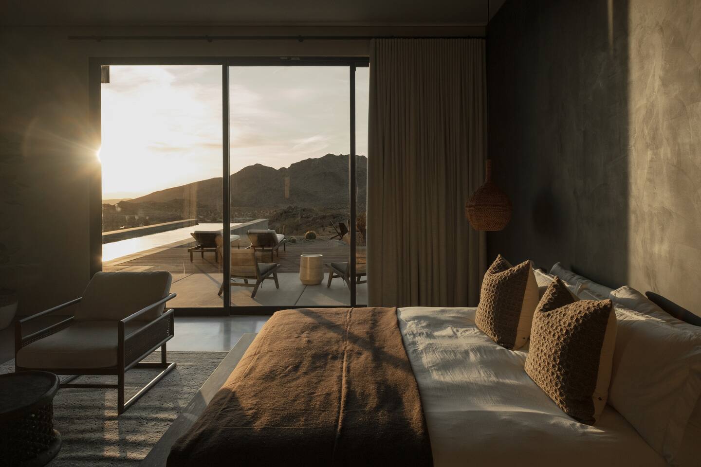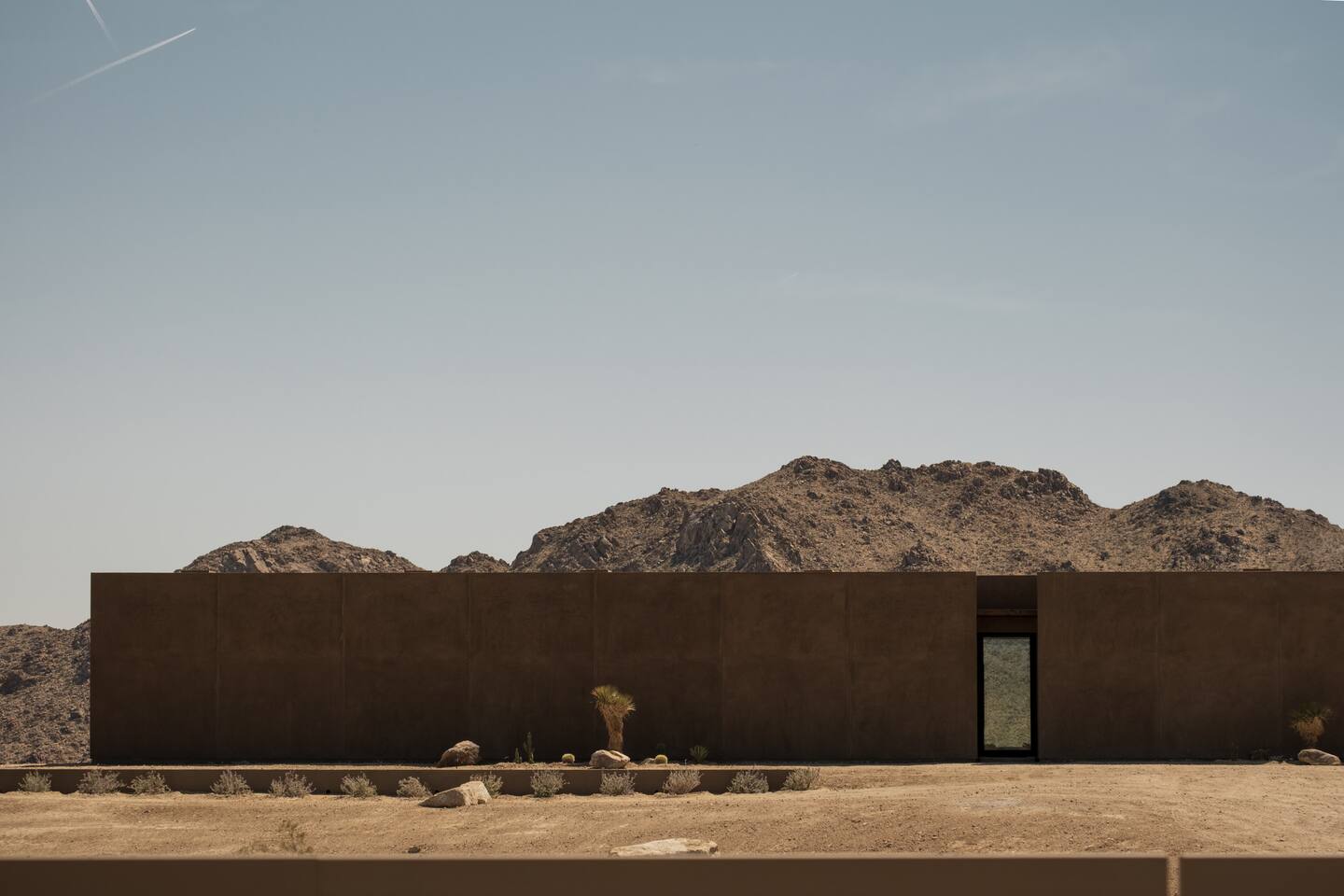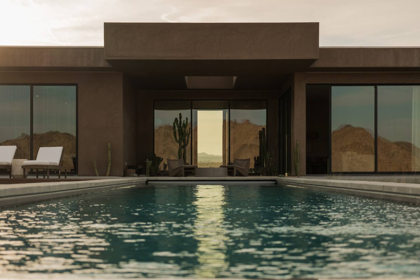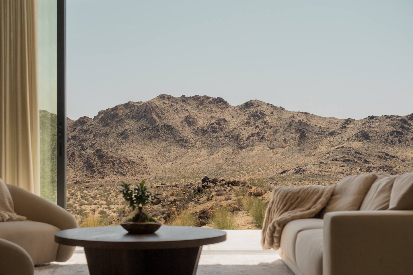 Amenities include: - 360’ views - Movie room - Indoor fireplace - Starlink Internet - Outdoor shower - Luxury furnishings - Outdoor gas fire-pit - 80’ infinity pool + spa - Retractable walls of glass - Bala and yoga equipment - Expansive indoor living area - Outdoor kitchen with pizza oven - Nearly 3000 sq feet of living space - Non-toxic cookware and cleaning supplies - Curated linens, robes and spa inspired amenities Perched atop a commanding promontory in the high desert, this architectural statement offers one of the most dramatic arrivals in Joshua Tree. A bold, brutalist entry frames the vast horizon, drawing you into a retreat defined by scale, precision, and sweeping 360-degree views that stretch to the snowcapped peaks beyond Joshua Tree National Park. At its heart, an 80-foot infinity pool cascades seamlessly toward the desert expanse, creating a mirrored plane that dissolves the boundary between earth and sky. Adjacent, a fully equipped outdoor kitchen invites open-air dining under the desert sun, while firelit evenings unfold against the endless horizon. Inside, luxury is expressed through natural materials and impeccable craftsmanship. Expansive sliding glass doors dissolve into the walls, erasing the threshold between indoors and out, and allowing the landscape to become part of the architecture. Furnishings throughout are curated for both comfort and sophistication, striking a balance between modern refinement and desert serenity. A private movie room offers intimate gatherings and cinematic experiences, while open-plan living areas orient toward the ever-changing desert light. Bedrooms are designed as sanctuaries, where walls of glass frame the vast panorama, offering a sense of quiet immersion in nature without sacrificing privacy or luxury. This desert residence is more than a home, it is a monumental stage for experiencing the beauty and scale of the high desert. Crafted for those who value drama, design, and unmatched views, it is a sanctuary suspended between earth and sky - a refuge designed to help guests slow down, reconnect, and experience the beauty of place.